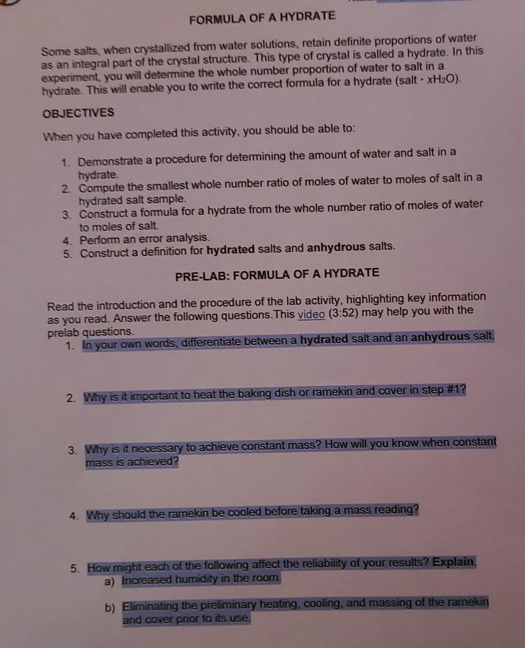 | Title: Pre Lab Questions The Determination Of The Empirical Chegg Formula Of A Hydrate Lab Answers |